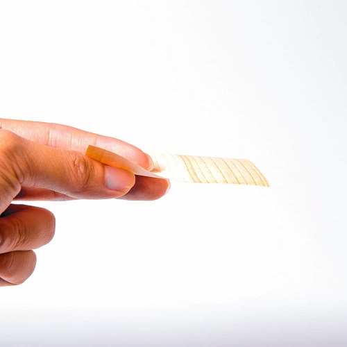 木の温もりで癒しを演出、天然木で作った厚さ0.15mm